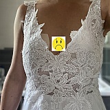 The neckline is indecent, way too deep, and the right breast cup sticks out shamefully. The lace on the back is poorly attached and constantly falls, which is unacceptable. On top of that, there are small stains on the fabric, which is totally unacceptable for a wedding dress.