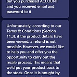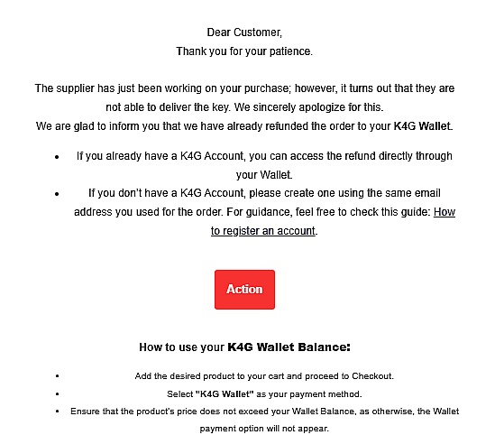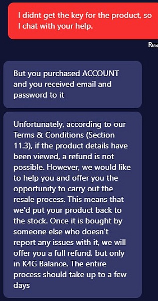 Instead of NBA 2k24 steam account details as advertised on their page they gave me link to external website which says - There was an issue with your code activation. After contacting them they said - "I'm sad to see there appears to be an issue with the key. However, please note that since you haven't bought the Purchase Protection, it means you've taken full responsibility for any potential defects the key may have. We shouldn't be able to assist you with it" So sold something which can not be used at all, basically stating they can sell defect items as long as they want. After I stated that I will open a chargeback they said - "We will put on a resale the product you have bought and have not used. Once the key is bought by another Customer, who does not report any issues with it, we will be able to offer you a refund only in K4G Balance amounted to the value of the product. The entire process should take up to a few days." How user will not report an issue when it can not be redeemed on that external website? Hahaha. I am going legal against this. People should unite and open collective actions before law for those kind of companies.